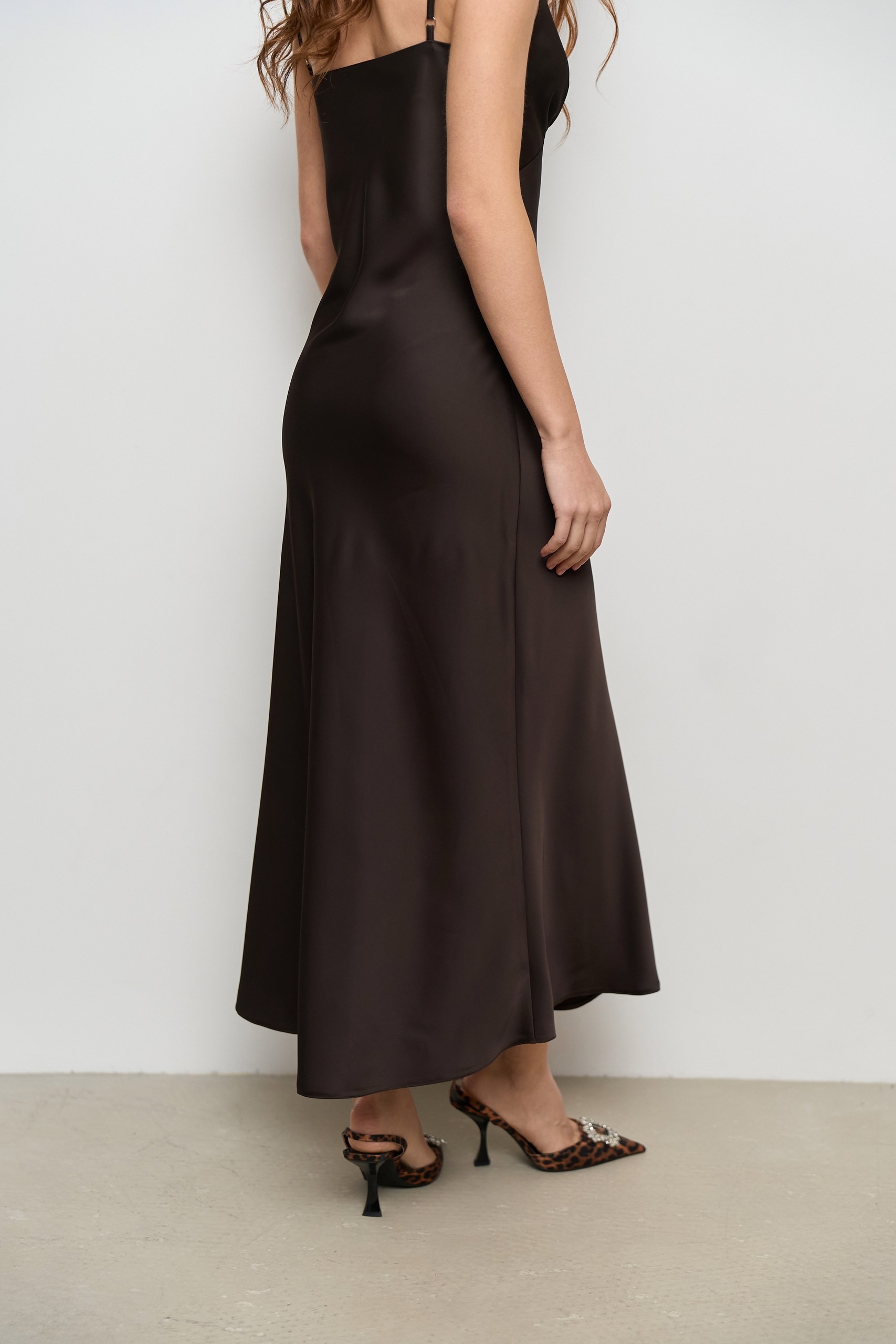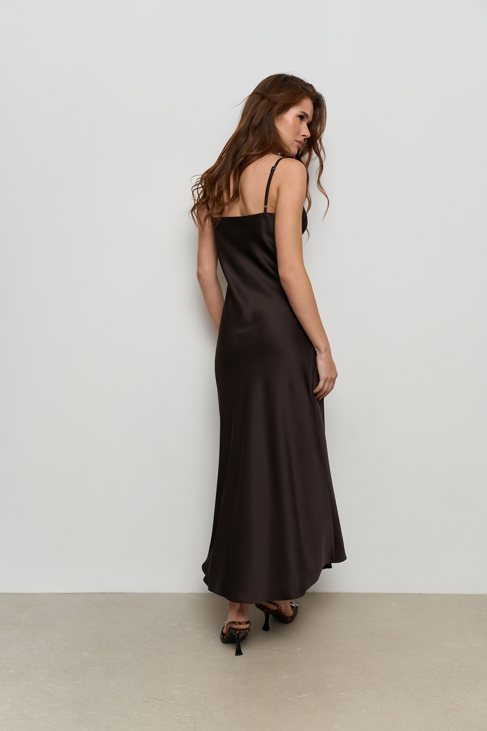 Шоколадна шовкова елегантна сукня ARTMON на тонких бретелях